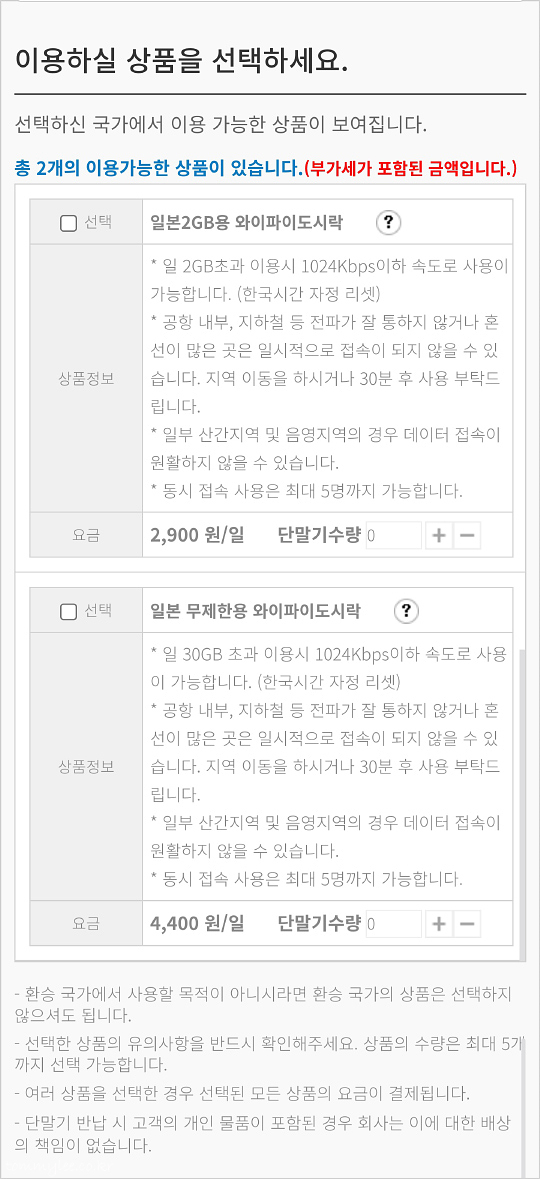 다음은 이용 상품 선택의 시간입니다.. 일본 2GB용 와이파이도시락은 하루 2,900원, 일본 무제한 용 와이파이도시락은 하우 4,400원입니다.. 2GB용 도시락은 하루 2GB, 무제한용은 하루 30GB까지 속도제한 없이 이용가능합니다.. 저의 추천은 무제한용 와이파이도시락.. 1,500원 차이면 무제한이 훨씬 유리한 거..