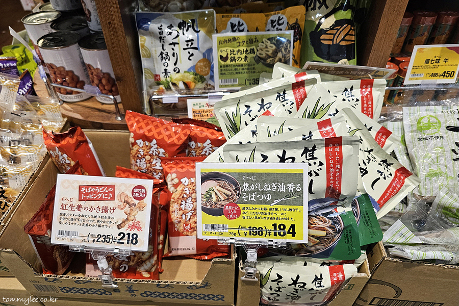 칼디의 PB브랜드인 모헤지 제품입니다.. 베니나마쇼가노 카키아게.. 235엔(2,209원).. 우오가시네기유카오루 소바츠유.. 198엔(1,861원)..